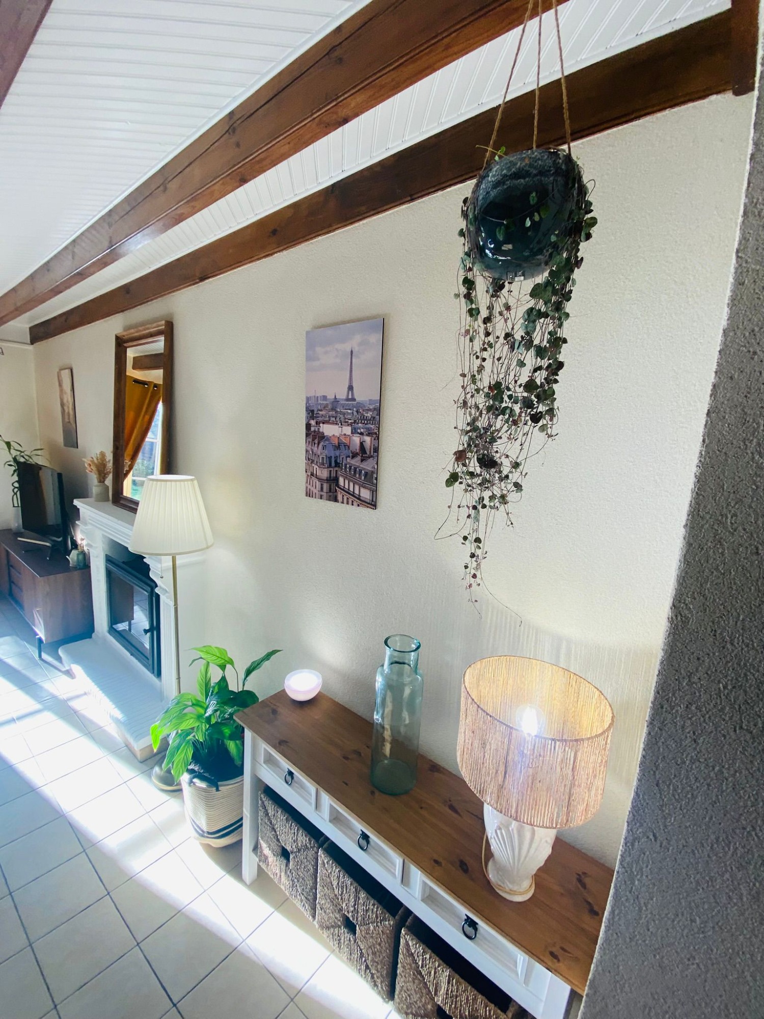 La lumière naturelle, diffusée par le Velux, baigne la pièce d’une clarté douce et apaisante, créant une atmosphère chaleureuse et agréable tout au long de la journée.