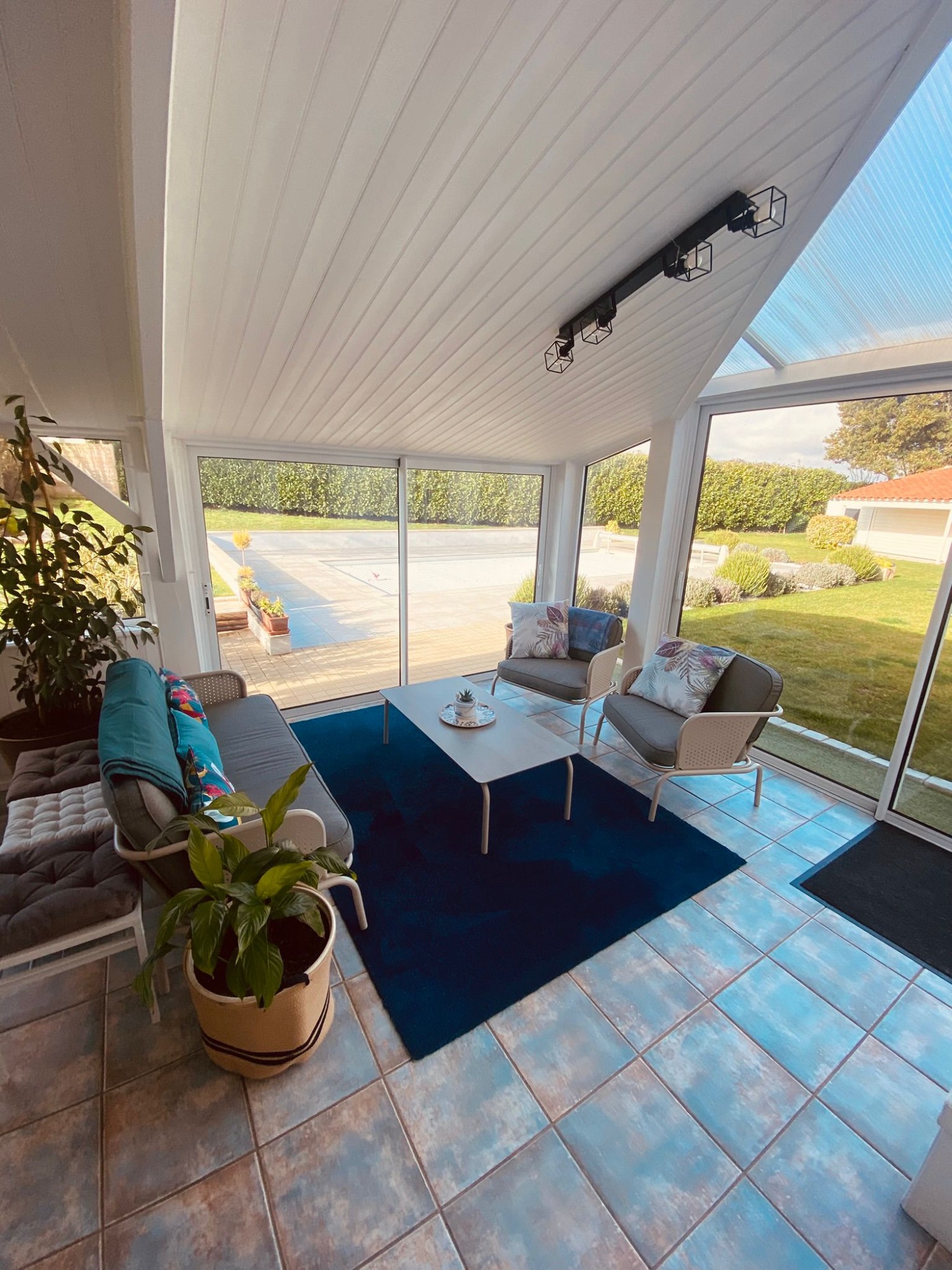 Baignée de lumière, elle offre une vue dégagée sur le parc arboré et la piscine, créant une sensation d’espace et de continuité avec la nature. Aux beaux jours comme en mi-saison, elle devient un lieu privilégié pour savourer un café face au jardin, lire en toute tranquillité ou prolonger les soirées dans une atmosphère douce et apaisante.