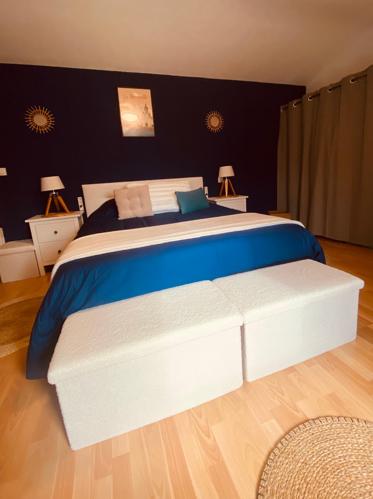 Le grand lit double, aux lignes sobres et confortables, occupe le cœur de la pièce et invite à des nuits paisibles, dans une atmosphère douce et apaisante. Les volumes généreux permettent de circuler librement et renforcent la sensation d’espace et de sérénité.