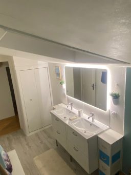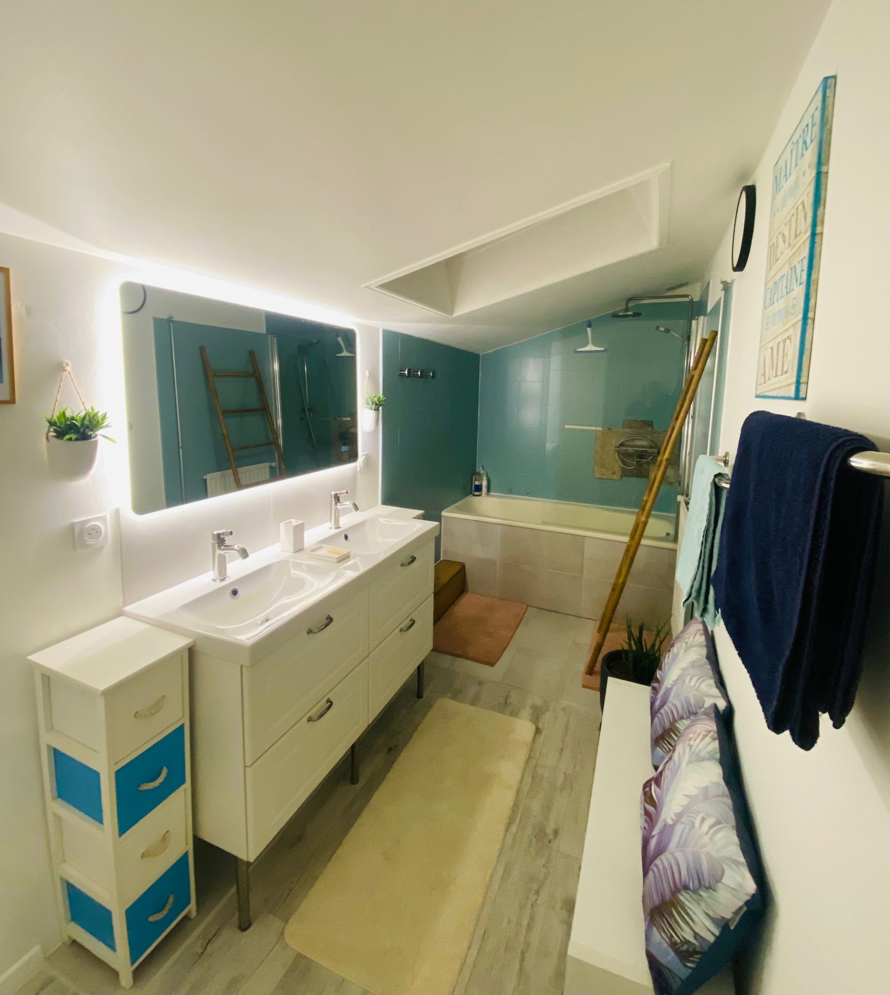 La double vasque apporte confort et praticité, permettant à chacun de disposer de son espace avec simplicité et élégance. La grande baignoire invite à la relaxation, aux moments de calme après une journée de découverte de la région ou de détente au bord de la piscine.