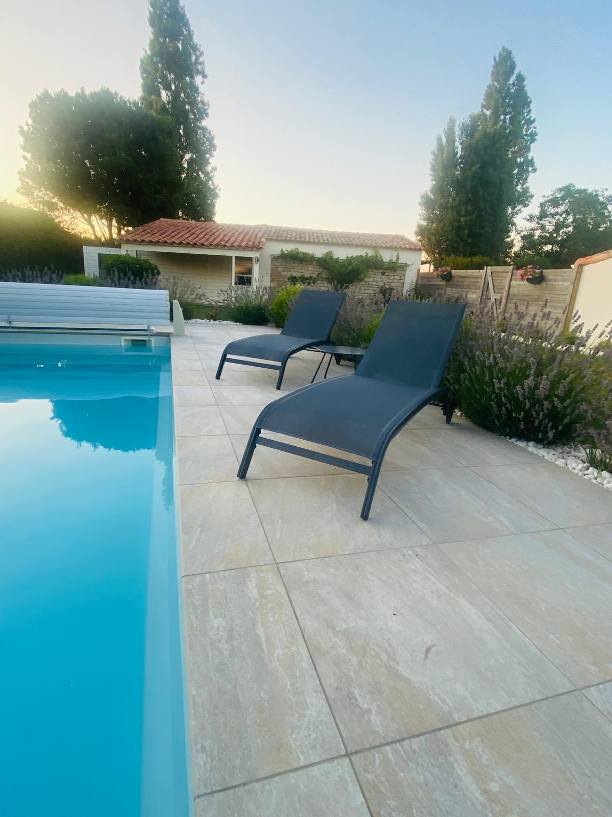 La terrasse aménagée au bord de l’eau accueille plusieurs bains de soleil, parfaits pour profiter pleinement du calme, lire à l’ombre ou simplement savourer la douceur du climat vendéen.